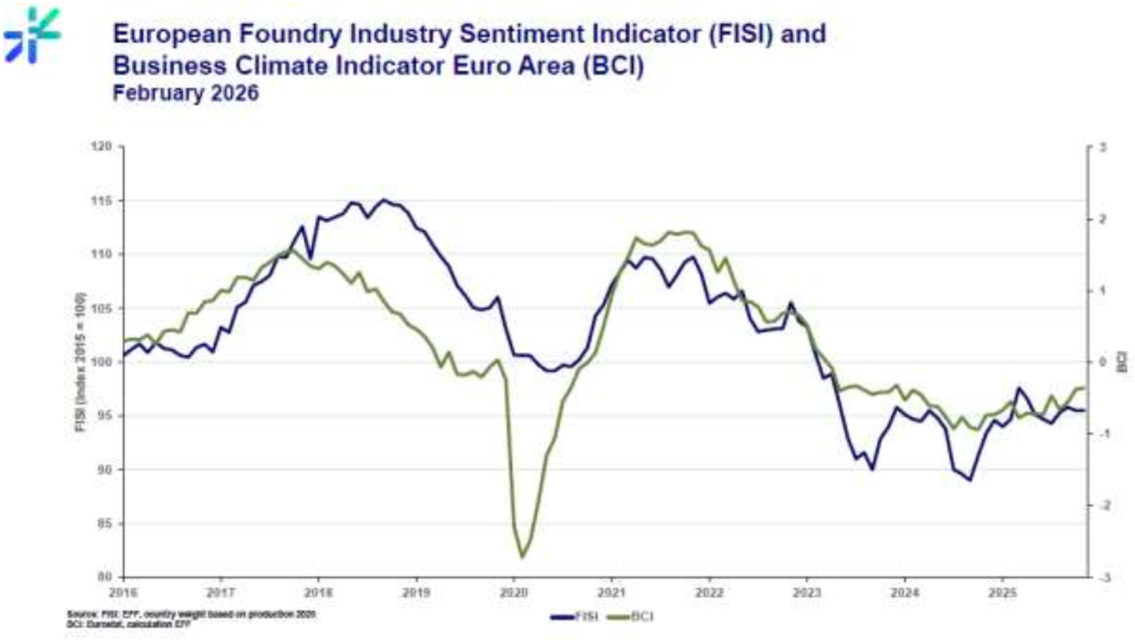 European Foundry Industry Sentiment Index (FISI), som publiceras månadsvis av European Foundry Federation, låg i februari 2026 kvar på samma nivå som föregående månad och uppgick till 95,5 punkter.