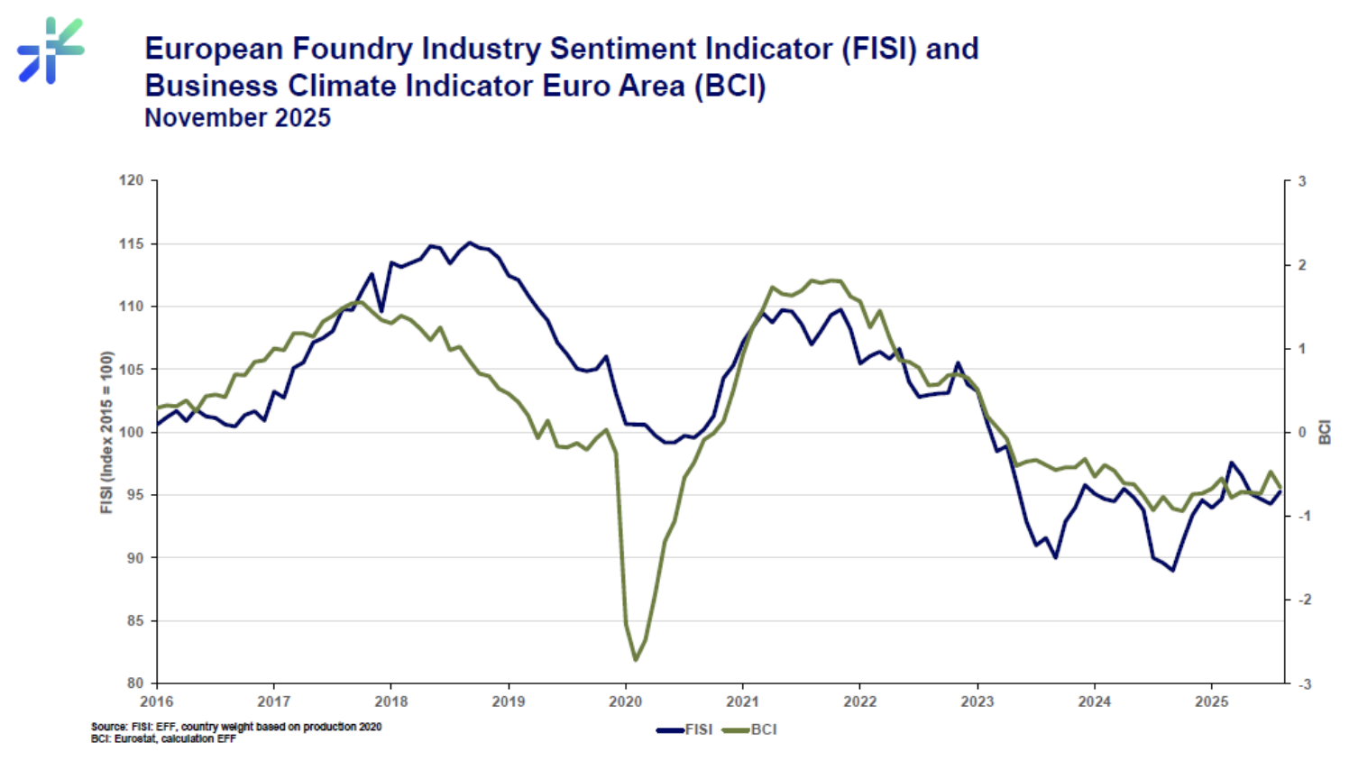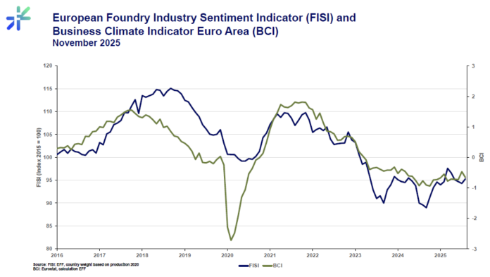 Det europeiska stämningsindexet för gjuteriindustrin (FISI), som publiceras månadsvis av European Foundry Federation, ökade med 1,0 punkt i november 2025 och nådde nivån 95,3.